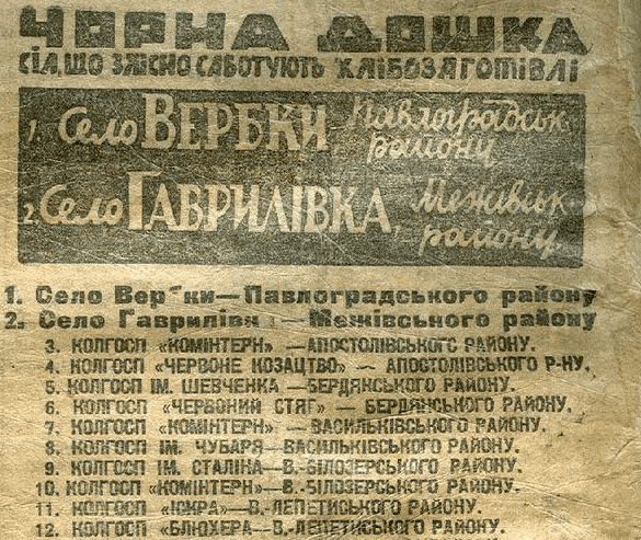 По состоянию на октябрь 1932 года в Днепропетровской области на «чёрные доски» было занесено 228 колхозов. А уже в декабре того же года начали появляться списки «неблагонадежных», по мнению советской власти, населенных пунктов и хозяйств.
