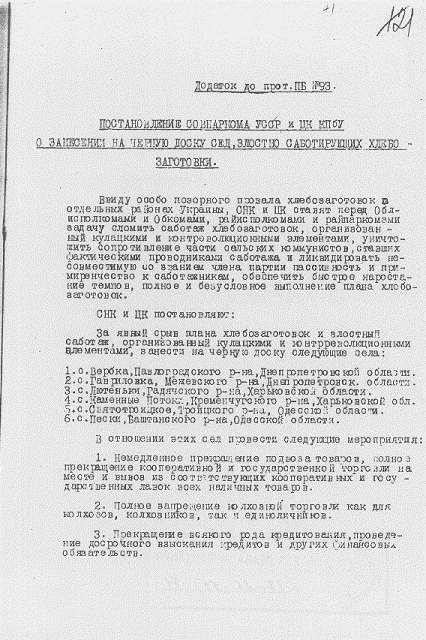 Так наказывали свободолюбивых украинцев, забирали всё – чтобы люди не выжили. Это была политика запугивания, как жителей того населенного пункта, который числился в таком списке, так и других, чтобы неповадно было. Сначала 23 села попали на «чёрную доску». За короткий период это количество возросло до 44 населенных пунктов.