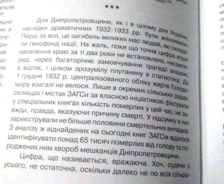 В 2008 году была издана книга серии «Национальная книга памяти жертв Голодомора 1932-1933 годов в Украине» по Днепропетровской области. Данное издание содержит мартиролог жертв Голодомора, то есть список погибших за 32-33 года. Насчитывает он 65 тысяч 332 погибших. Однако, опять же, это только те цифры, которые были доступны в архивах, и они не являются окончательными. Поскольку по нескольким районам области полностью отсутствуют данные: это Апостоловский, Новомосковский, Петриковский, Криворожский и частично Криничанский районы.