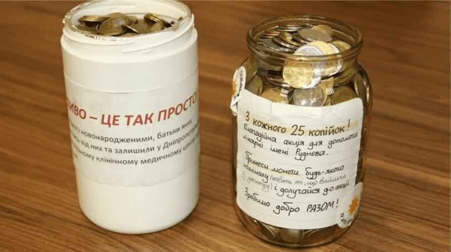 Инициаторами благотворительности стали ребята из молодежного совета Днепра, главой совета является Рафаэль Кижнер. Он сообщил, что к акции присоединилось множество неравнодушных людей из разных сфер, также участие приняли учебные заведения разного профиля. Суть данного мероприятия заключалась в том, чтобы показать людям, что даже бесполезной монетой можно спасти жизнь брошенному ребенку.