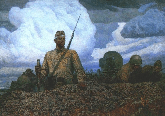 Суть згаданого вже соцреалізму полягала у возвеличенні партії, демонстрації «щасливого» радянського життя, достатку та руху до «світлого комуністичного майбутнього». Зображення війни через подібну пласку призму державної пропаганди можемо знайти, до прикладу, у творчості російського художника того періоду – Петра Кривоногова. На полотні «На Курській дузі» 1949 року ми не знайдемо людей – лише статичні фігури, одна з яких, центральна, виконує роль бездушної машини. Погляд солдата відчужений, на обличчі невелика посмішка, постава струнка і рівна – йому не потрібно ховатися в окопі, аби зберегти своє життя, адже воно йому не належить. І це все – батальна сцена однієї з найбільших в історії танкових битв, у якій загинуло понад 800 000 солдатів. Саме такі сенси були потрібні радянській державі. Та Вадим Сідур не мав морального права залишити післявоєнним поколінням подібний образ війни. «Я вважаю, що не зовсім правильно говорити про мій “пекучий” інтерес до війни, насильства, нелюдських жорстокостей. Це не інтерес і навіть не обов’язок, а життєва потреба. Багато років я намагаюся і не можу позбутися того, що переповнило мене в ті часи», – писав митець.