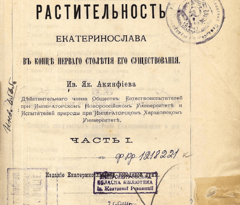 У Катеринославі фенологічні спостереження стали систематичними наприкінці 19-го століття. Вперше спостерігати за деревною та трав’янистою флорою нашого регіону почав Іван Якович Акінфієв (1882-1885 роки). Уперше свою працю із зафіксованими результатами спостережень за рослинністю Акінфієв підготував до святкування 100-річчя від дня заснування Катеринослава 1889-го року. У цій книзі під назвою “Рослинність міста Катеринослава наприкінці першого століття його існування” автор описав 186 рослин із внесенням подробиць усіх фаз розвитку, а також досить цікавими висновками. Одним із цікавих висновків Акінфієва є, наприклад: “У процесі цвітіння рослин спостерігається певна сувора послідовність”; “Проміжок часу від цвітіння одного виду рослини до цвітіння іншого в різні роки не однаковий. Причина – нестабільні кліматичні умови в певний сезон в різні роки”.